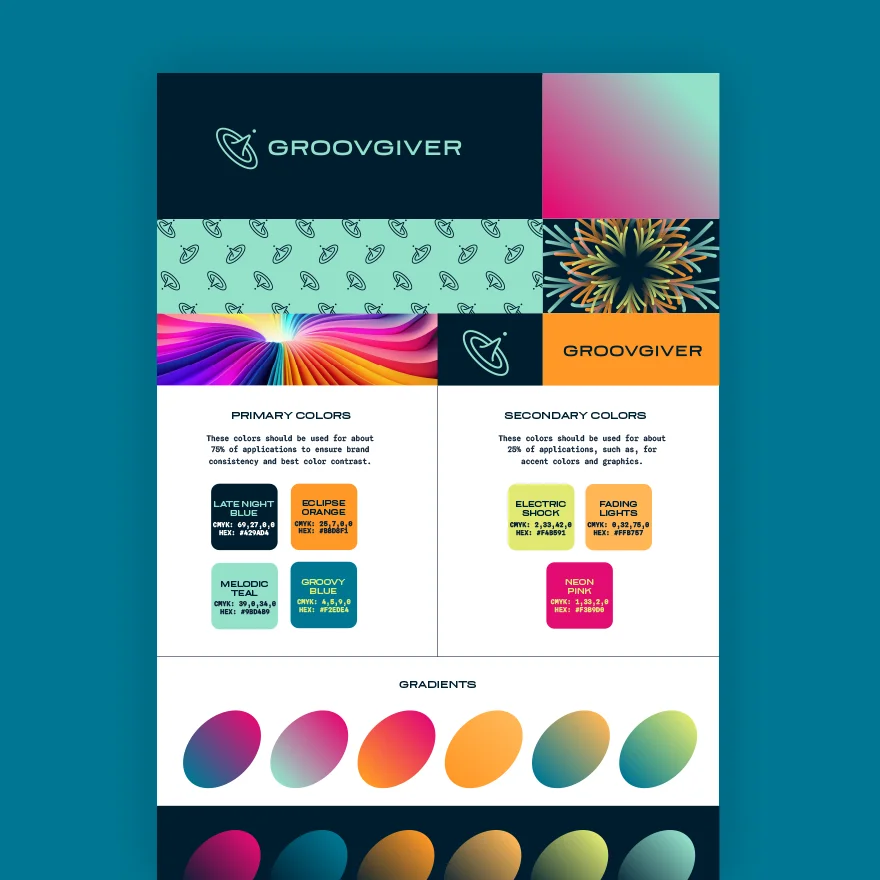 In creating GroovGiver’s music-inspired logo and branding, we explored various directions during the sketching phase. I played with concepts of movement, flow, depth, soul, growth, journey, creativity, collaboration, and curiosity. It was also crucial to embody the idea of “giving” from the brand’s name.