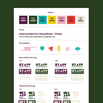 For ST.ART Artist Programs, we were working with words like: experimental, transformation, exciting, audacious, focused, smart, community, youthful and weird to inspire a flexible brand identity system.